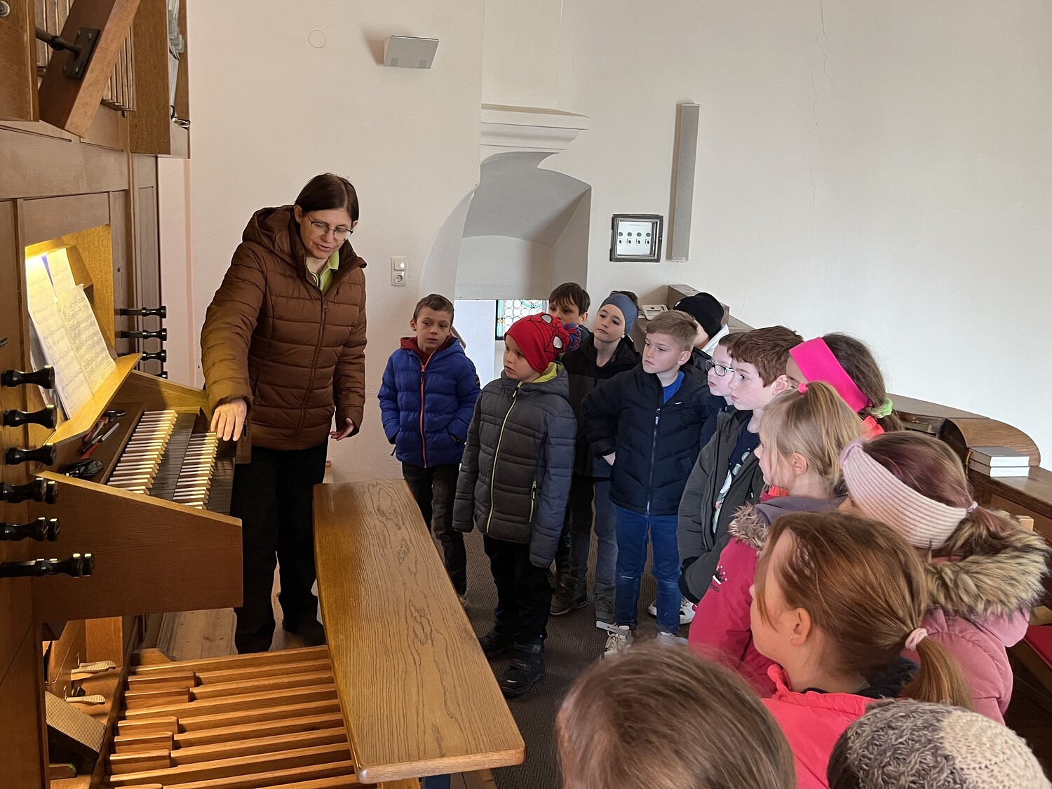 Für die Erstkommunionkinder ist es immer ein spannendes Erlebnis, den Raum der Kirche zu entdecken. Ein großes Danke gebührt unserer Or­ga­nis­tin Brigitte Resch, die den Kindern eine spannende Or­gel­füh­rung er­mö­glich­te.
