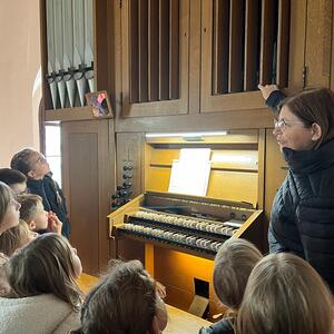 Die Volksschulkinder entdecken die Orgel in der Kirche